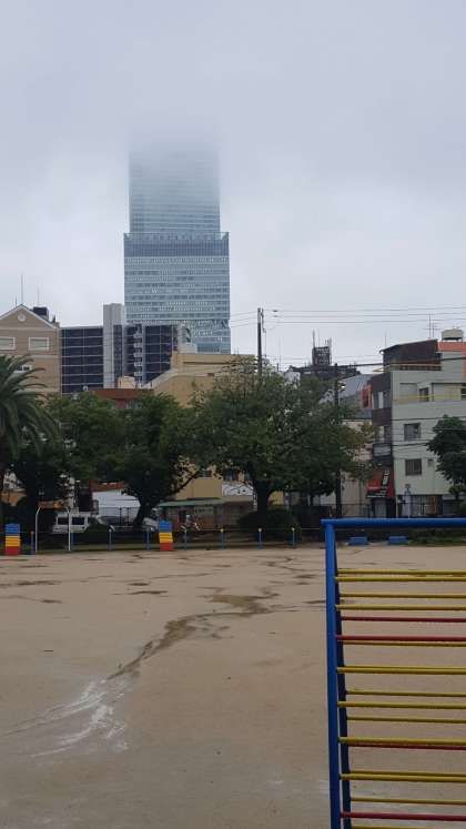 天王寺小学校は、土砂降りの朝となりました。ハルカスも上階はかすんで見えません。もうしばらく降り続きそうですので、気をつけて登校しましょう。