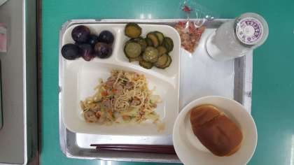 今日の献立は、わふうやきそば・きゅうりのからみづけ・ぶどう(きょほう)・こくとうぱん・牛乳です。