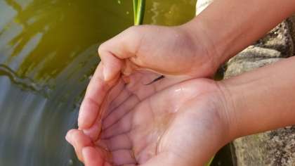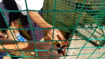 ザリガニ池は大盛況です。「校長先生見て」といってザリガニや小さな魚を見せてくれました。
