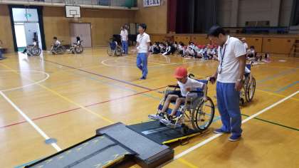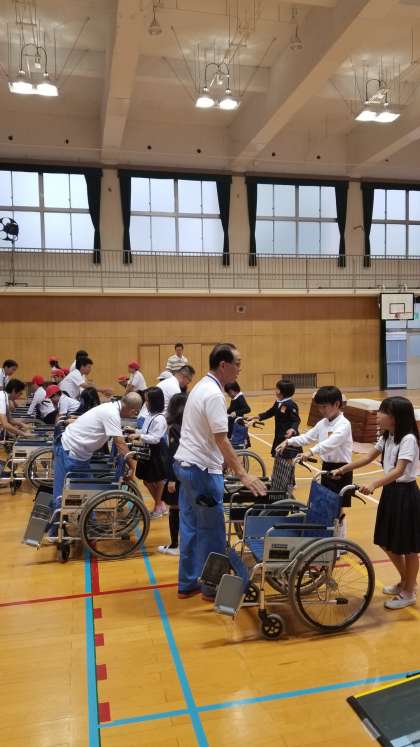 本日3年生が3・4時間目、体育館で車イス体験を行い学習しました。
