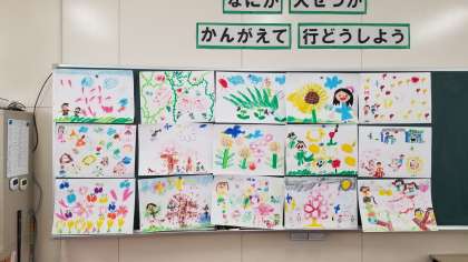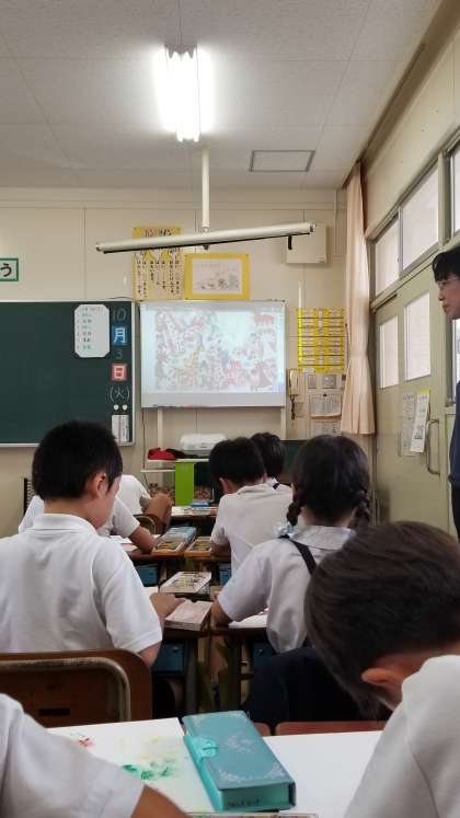 2年1組の図工の様子です。画面に映し出された絵を参考に一生懸命作品を作っています。素晴らしい作品ができあがりました。