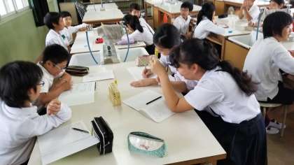 6年2組の理科の授業です。理科室で実験をしています。