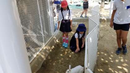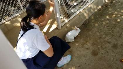 休み時間を活用して、飼育委員のみなさんがウサギとのふれあいをしています。