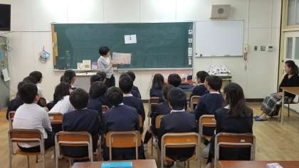 本日、2時間目と3時間目に高学年(4年〜6年)の各クラスで「お話の会」がありました。ボランティアの方による、本の読み聞かせの取組です。