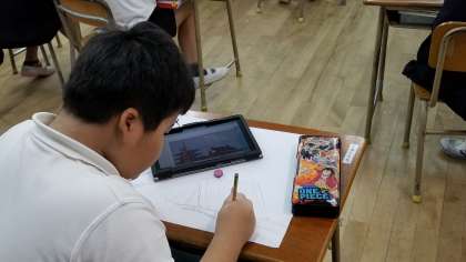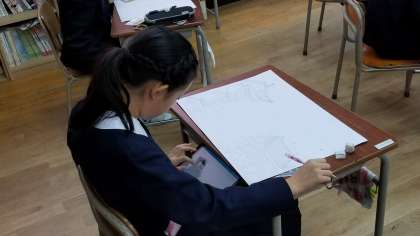 タブレットで撮影した四天王寺の写真をみて絵を描いています。細かな部分まで丁寧に描くことができています。