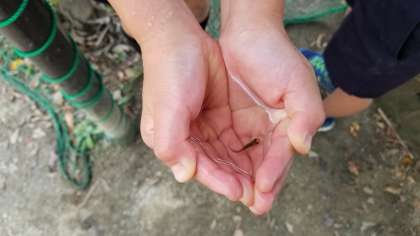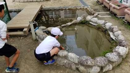 ザリガニ池でメダカを手ですくっています。