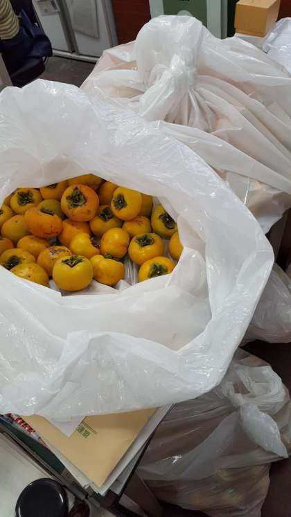 天小の地下道のそばにある柿の木に、柿の実がたわわに実りました。児童分の実が収穫できたので,1人1個ずつ持って帰ってもらいます。楽しみにしていてください。