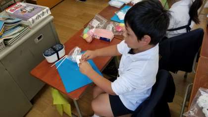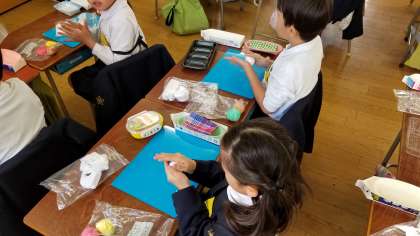 お弁当のおかずを粘土で作っています。色の違う粘土を平たくのばして重ねあわせ、それを丸めて糸で切ると、卵焼き等のおかずができあがります。