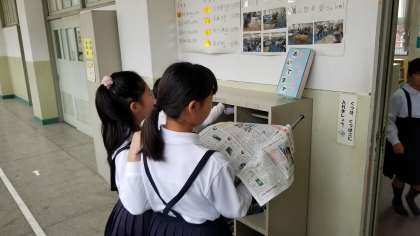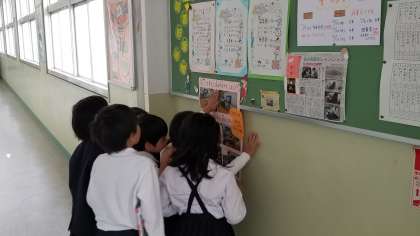 図書館前の掲示物を熱心に見ています。