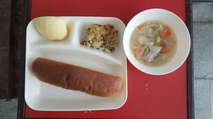 今日の献立は、スープに・ほうれん草のグラタン・りんご・黒糖パン・牛乳です。