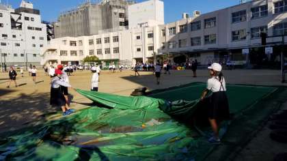 雨水のたまった人工芝のシートをきれいにしてくれている児童もいます。