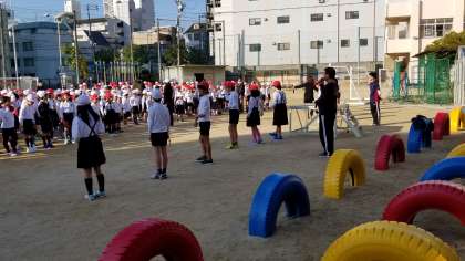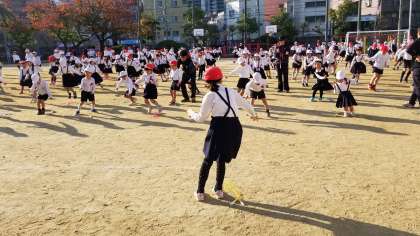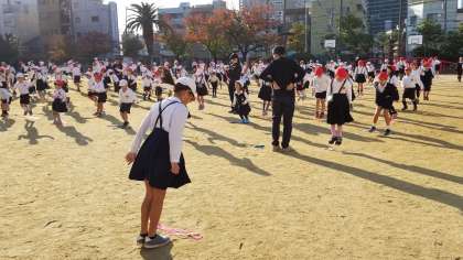 縄が周囲の児童に当たらないように、広がって活動をします。まずは準備運動です。なわとびを活用して前後左右にステップしています。