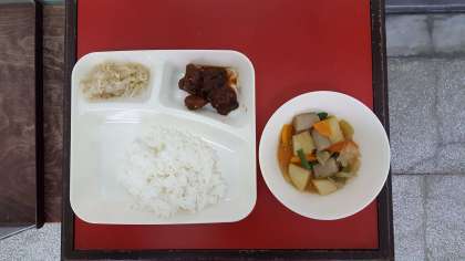 今日の献立は、くじらのオーロラに・じゃがいもとこんにゃくのにもの・もやしのゆずの香あえ・ごはん・牛乳です。