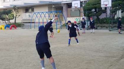 運動場では4年生と5年生がそれぞれドッジボールをしています。