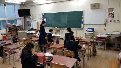 高学年棟の教室・廊下の様子です。ことばの時間やイングリッシュタイムが始まるまでの間、友だちとふざけあったり、自習をしたりしてすごしています。