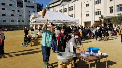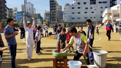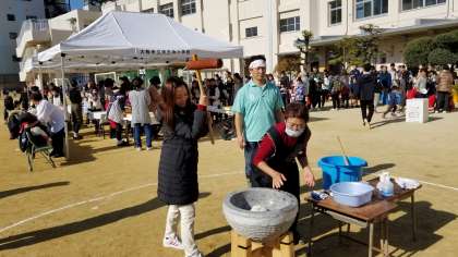 晴天のもと、地域の方や保護者・学園の先生も一緒になっておもちをつくことができました。