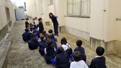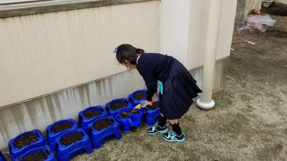 先生の指示で植木鉢を並べて水やりをしています。