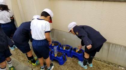 あまり水をやりすぎると球根がだめになってしまいます。明日からは先生の指示で水やりをします。チューリップの花の色は咲いてからのお楽しみだそうです。