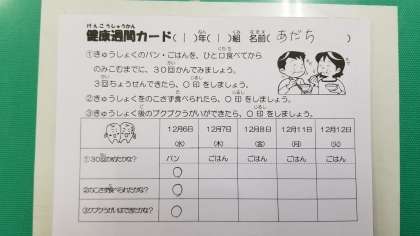 写真(下)は今日の児童集会でもお話のあった「健康週間カード」です。今日からかみかみ週間を設け、このカードを使ってご飯やパンをひと口30回以上かむ習慣を身につけます。