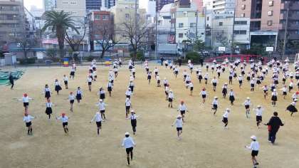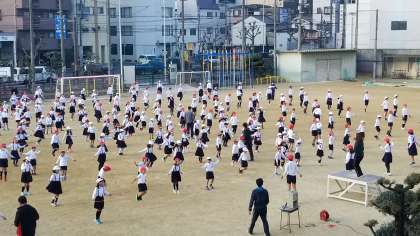 なわとび運動です。準備運動の後、音楽に合わせていろいろな跳び方で運動します。