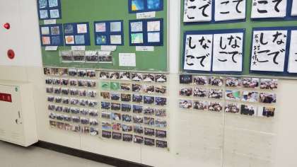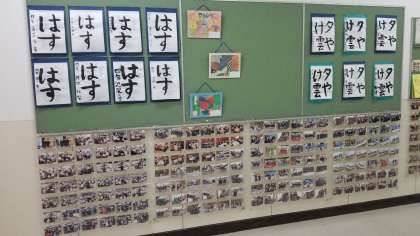 授業の作品や修学旅行の写真などが掲示されています。