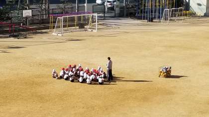 運動場で体育をしています。先生の話をしっかり聞いています。