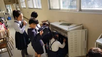 下の写真はタブレットを活用した授業の後、各自でタブレットを片づけているところです。