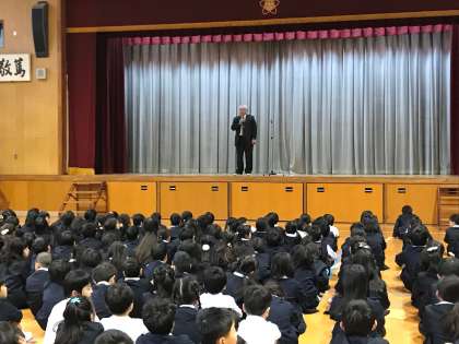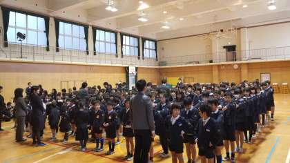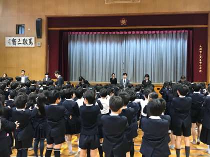 大阪市歌・校歌斉唱の後、校長先生から「2学期の振り返りと、お家・学園での大掃除のお手伝い」についてお話がありました。