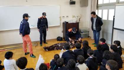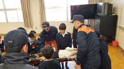 救護所体験です。簡易担架をつくり、搬送体験をしています。