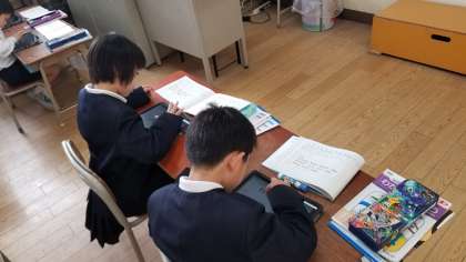 1年2組の算数の様子です。文章問題を読み取り、タブレットを使って図式化して問題を考えています。