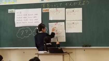 図から考えた式について発表しています。答えは同じでもいろいろな式が発表されました。最後の練習問題も真剣に考えていました。