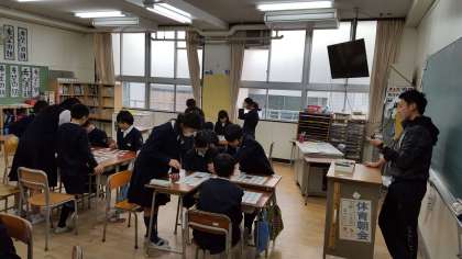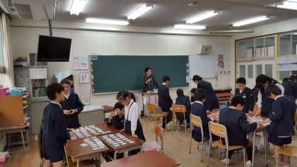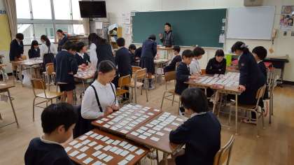 「住之江の〜〜〜岸による波よるさへや〜〜〜・・・・・」竹内先生が朗々と読み上げる上の句が、教室中に響き渡ります。みんな一生懸命札を取っていました。