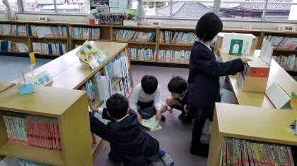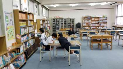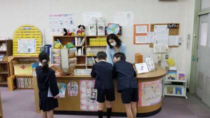 お昼休みの図書館開放の様子です。今日は「ティアラさん」も来てくれています。たくさん本を読みましょう。