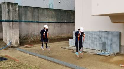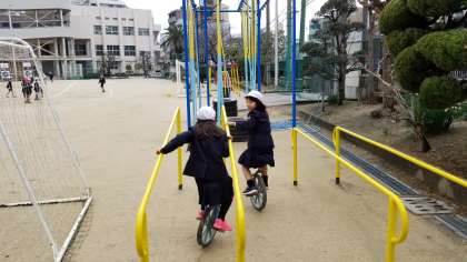 竹馬や一輪車で遊んでいます。