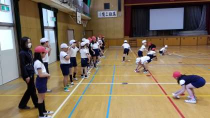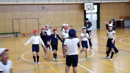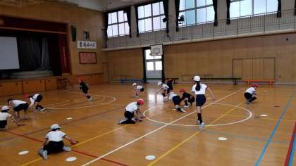 体育の授業です。丸いオセロのような赤白の札を自分のチームの色にかえしていきます。単純ですが運動量の多い楽しいゲームです。応援している児童も力が入り、大きな声が体育館いっぱいに響いていました。