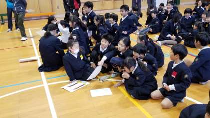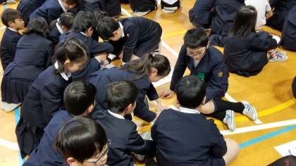 今日の集会は「○○と言えばゲーム」です。「お正月と言えば」「おせち」というように連想するものを班で考えます。