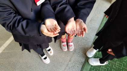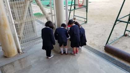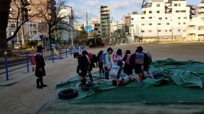 今日も寒さの厳しい朝になりました。人工芝のカバーにできた氷に子どもたちが集まっています。