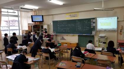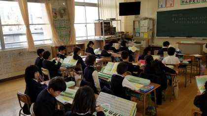 2年生の音楽と算数の授業です。「春が来た」ときれいな歌声が聞こえてきます。算数の授業では先生に答えのチェックをしてもらっています。大きな赤丸をたくさんもらっていました。