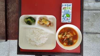 今日の献立は、鶏肉とチーズのカラフル焼き・野菜のミネストローネ・ブロッコリーのサラダ・ごはん・牛乳です。