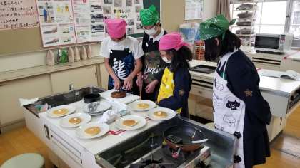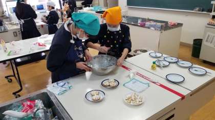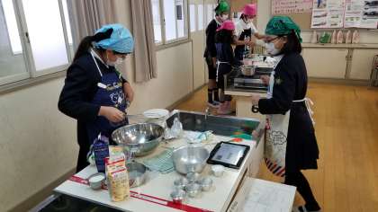 みんなで協力して作っています。家庭科教室がとても甘くいい匂いがします。