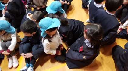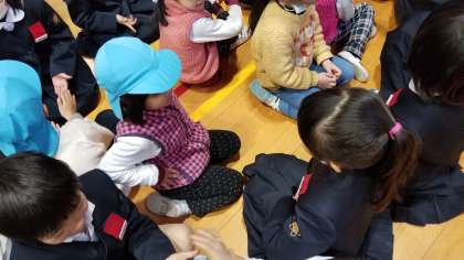 今日の2時間目、体育館で1年生と大江幼稚園との交流が行われました。