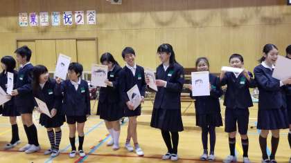 在校生がリレー形式で卒業生の似顔絵を作成しました。似顔絵を受け取った6年生から笑顔があふれました。