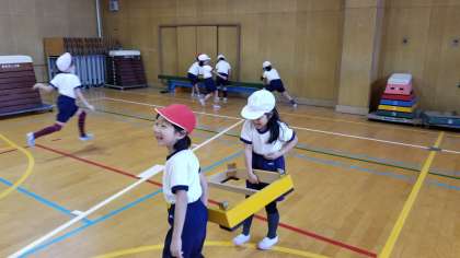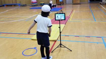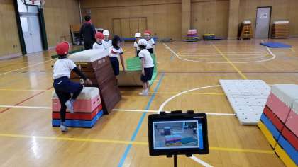 タブレットを活用して、自分たちで教具の配置や運動の内容を確認しながら学習をしています。