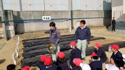 来年収穫して理科の授業で使うジャガイモです。管理作業員さんの説明をしっかりと聞いて活動しています。