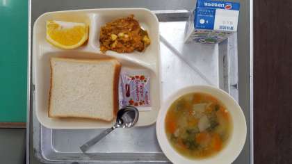 今日の献立は、豆腐のミートグラタン・スープ煮・はっさく・食パン・牛乳です。