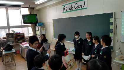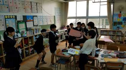 英語活動の授業で、桃太郎の英語劇の練習をしています。