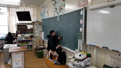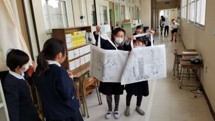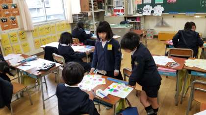 写真上 3年児童が作品を見せてくれました。「色を塗らないのがかっこいいねんで」と教えてくれました。