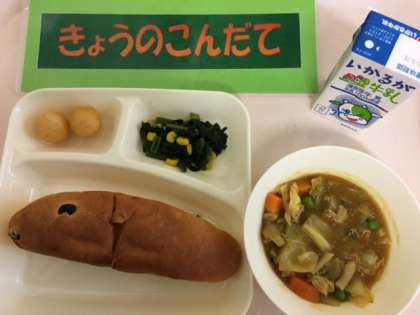 今日の献立は、豚肉と野菜のカレー煮・ほうれん草のソテー・あげポテトもち・レーズンパン・牛乳です。
