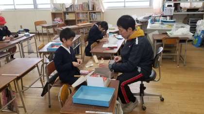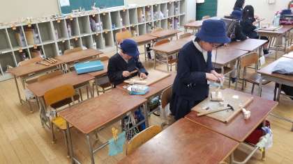 先生と一緒に図画工作の作業をしています。金槌を器用に使ったり、紙やすりで丁寧に仕上げの作業をしていました。先生とのおしゃべりも楽しそうでした。