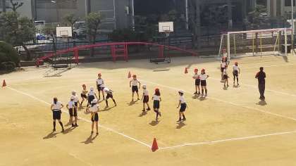 タグラグビーをしています。タックルのかわりに腰につけているタグをとります。グリッドの中で安全にゲームができています。